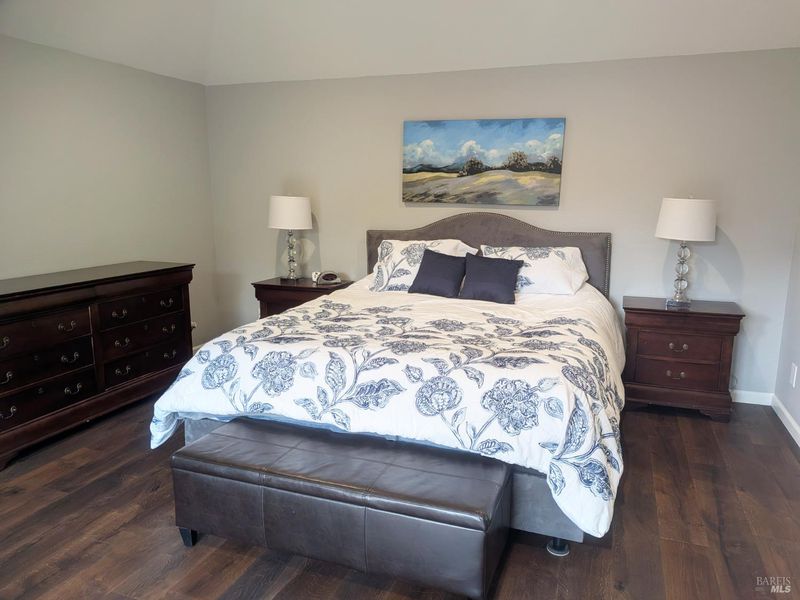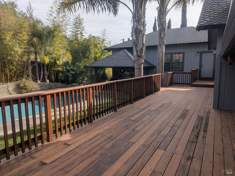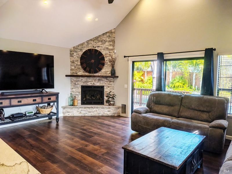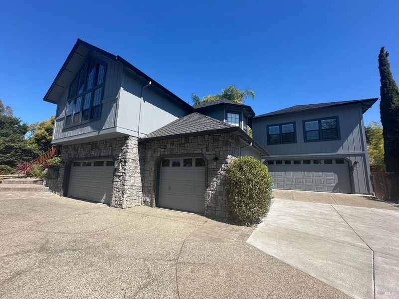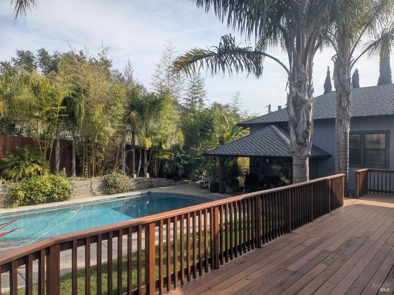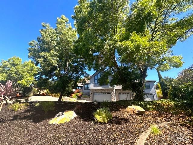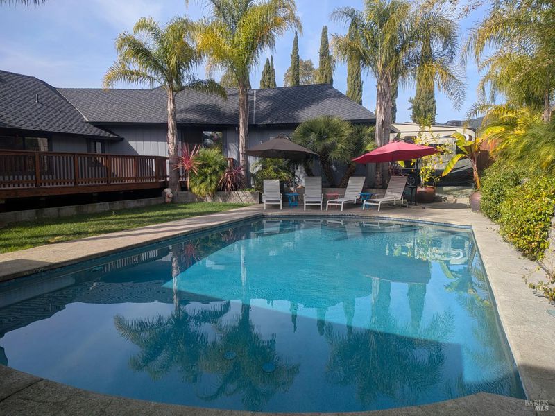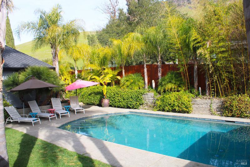 Imagine sipping estate wine at sunset in your own private resort, just minutes from renowned wine country. This spectacular custom home welcomes you through a grand formal entry and showcases luxury plank wood flooring throughout. The elegant formal living room features soaring cathedral ceilings, while the expansive family room has a stone fireplace and opens to a private deck with sweeping views of lush lawns, vibrant gardens, a sparkling salt water inground pool, and a private cabana perfect for unforgettable evenings and entertaining. The remodeled gourmet kitchen is a chef's dream, offering custom cabinetry, designer Italian marble countertops, stainless steel appliances, and a generous island ideal for gatherings, all complemented by a charming breakfast nook. Retreat to the romantic primary suite with a true sitting area or private office with stunning views, a remodeled designer bathroom, spacious walk-in closet and a private door leading to a beautiful deck over looking paradise! Two additional generously sized bedrooms, along with another remodeled bathroom. An inside laundry room complete with built-in cabinetry for complete functionality. Car enthusiasts and hobbyists will appreciate the oversized three-car attached garage plus a four-car 880 sq ft detached garage/shop. In addition above the four-car detached garage there is an impressive approximately 880 sq. ft. game room with a private full tile bath - ideal as a guest suite, in-law unit, or income opportunity. A gated and fenced RV parking area adds even more versatility. All of this is set on a private .50 acre lot with breathtaking hill views, offering exceptional privacy while remaining within walking distance to shopping, transportation, and excellent schools. This is the last address in the city limits right before heading to the countryside.