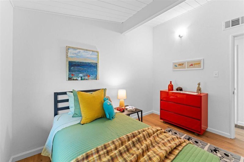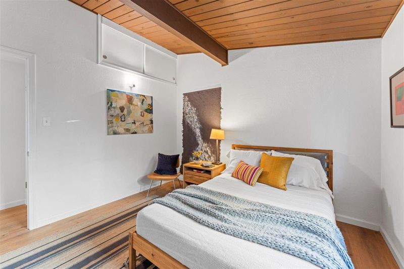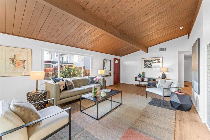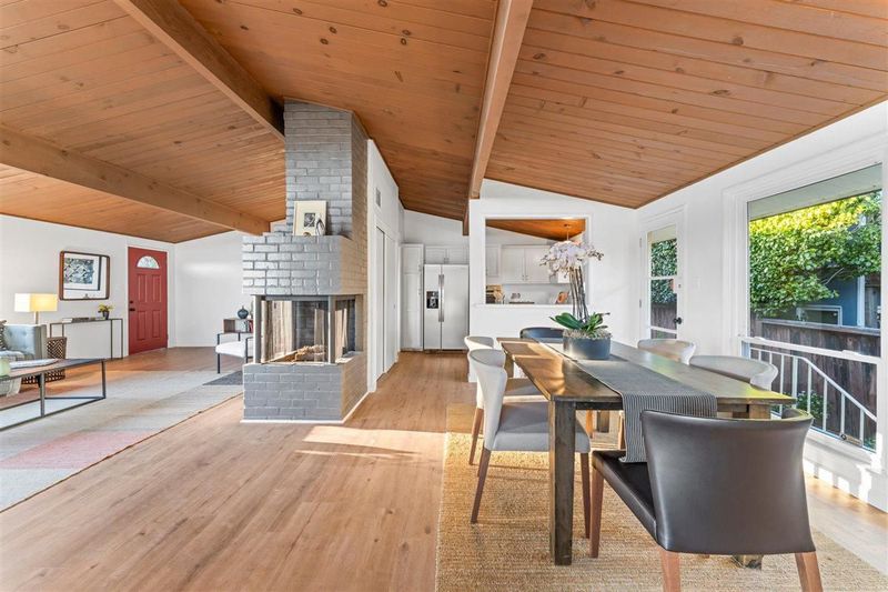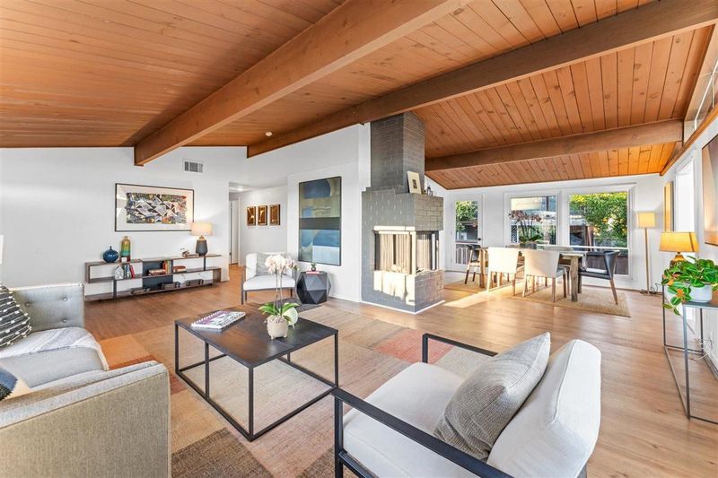 This fabulously updated Mid-Century Modern home showcases an incredible open floor plan with stunning post-and-beam ceilings throughout. The gracious living room flows effortlessly around a sleek modern fireplace into an open dining area and kitchen, all surrounded by expansive windows and striking architectural design. Whether entertaining or unwinding, the light-filled dining and family rooms offer the perfect setting, bathed in natural light and framed by beautiful south bay views. With three bedrooms and two bathrooms, this home is ideally situated in the sought-after Maxwell Park neighborhood and truly offers everything you could want.