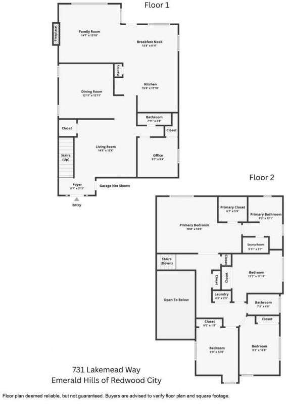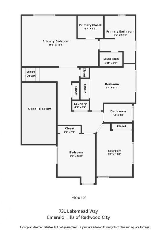 Welcome to Emerald Hills of Redwood City ~ Come enjoy this beautifully updated home with 4 bedrooms upstairs (very rare), a primary bedroom suite with a dry heat sauna (very cool), three additional bedrooms perfectly separated, gorgeous kitchen with breakfast bar, breakfast room/nook, stainless steel appliances, striking countertops, endless cabinets and counter space plus an impressive 6 burner stove with grill, plus you will love the pantry. You'll find the perfect family room off the kitchen with a wood burning fireplace, display shelves, cabinets, large picture window, access to your entertaining/dining deck and backyard with a nice peak of the bay and eastern hills. Also, there is a office/den downstairs nicely hidden away with built-in cabinetry and an adjacent half bath. Jump outside out on your deck, or step down to a large turf area, patio and plenty of planting opportunities in your level backyard - yes, level backyard suitable for whatever you like. There is also an honest two-car garage and a driveway that could accommodate 4 cars or a oversized vehicle or boat. Come Discover Emerald Hills and it's "Throw Back" lifestyle and feeling with the Elk's Club just minutes away with golf, pool, tennis, summer music and so much more. You will LOVE living here!