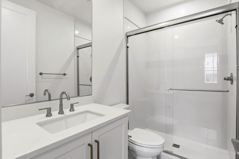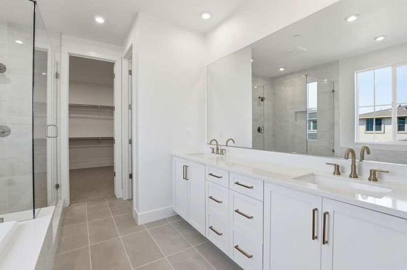 - Double Sinks, Stall Shower, Shower and Tub, Solid Surface, Tile, Full on Ground Floor, Half on Ground Floor, Primary - Stall Shower(s), Primary - Sunken Tub