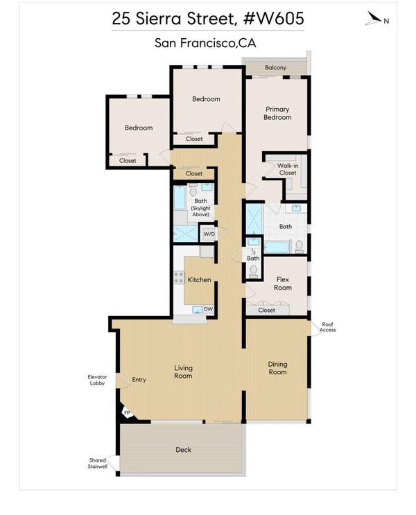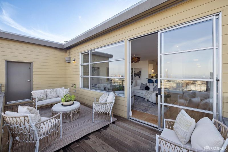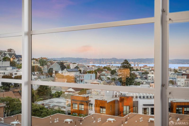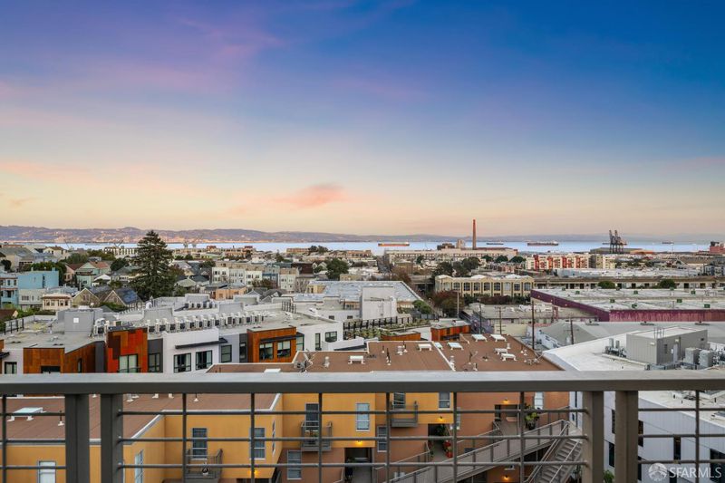 At 25 Sierra St #W605, everyday living feels elevated. Located on the top floor, this expansive 3-bedroom + flex room, 2.5-bath residence captures sweeping Bay views to the Oakland Hills and beyond. Thoughtfully designed for both relaxation and connection, the open-plan living and dining areas flow seamlessly to a generous walk-out deck perfect for morning coffee, sunset cocktails, or alfresco dinners overlooking the water. The elevator opens directly beside your front door, adding a sense of quiet luxury and convenience from the moment you arrive. Inside, a well-appointed kitchen with stone countertops, stainless steel appliances, and a gas range makes cooking and entertaining effortless. Three spacious bedrooms and a flex room/office provide room to grow, create, play, or unwind. Enjoy two full bathrooms (one with skylights), a stylish guest powder room (with skylight), wood floors in the living areas, and in-home laundry. Two-car parking, including one space conveniently located next to the elevator, adds everyday ease. This residence offers a rare blend of light, views, space, and convenience, ideal for those who value generous square footage, flexible layout options, and a vibrant neighborhood hub at the heart of San Francisco's innovation corridor. Prime Potrero Hill/Dogpatch location near Caltrain, Mission Bay, Pier 70, Chase Center, UCSF, dining, shopping, and Crane Cove Park. Easy freeway access. Welcome to city living - elevated!