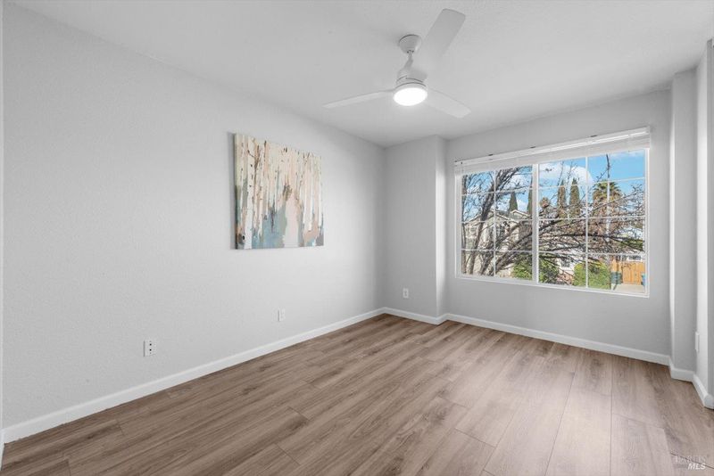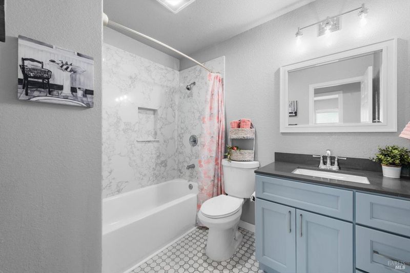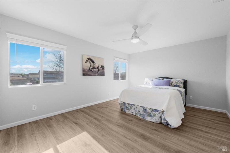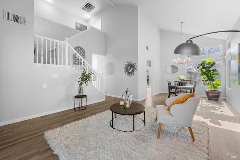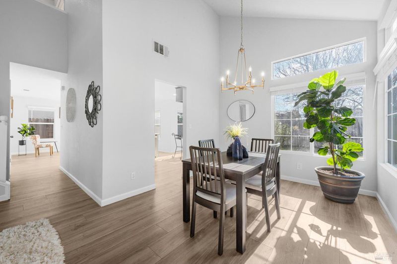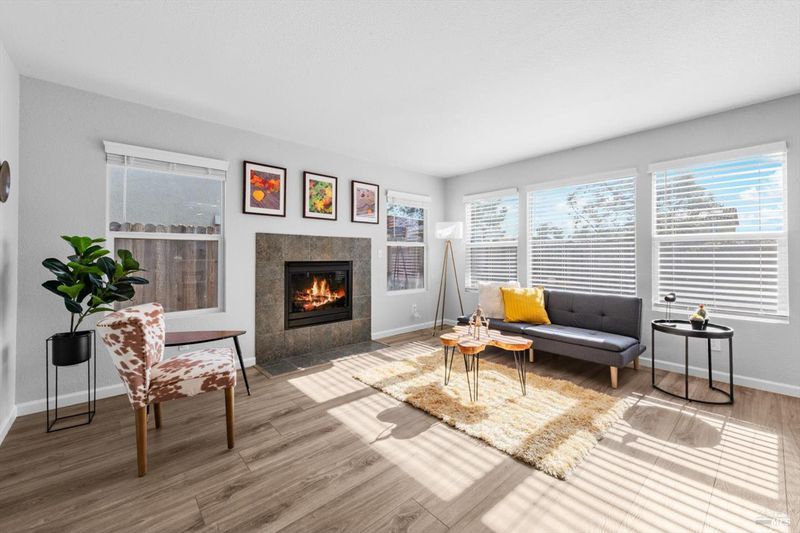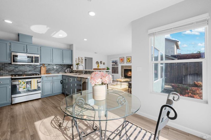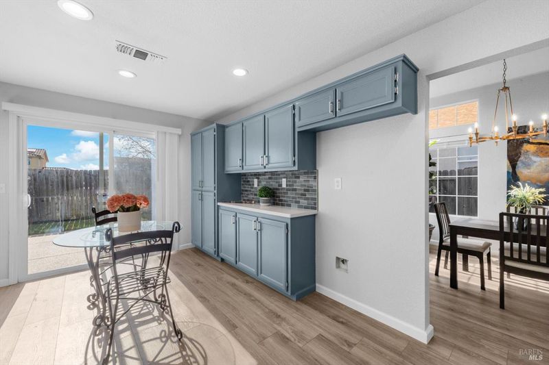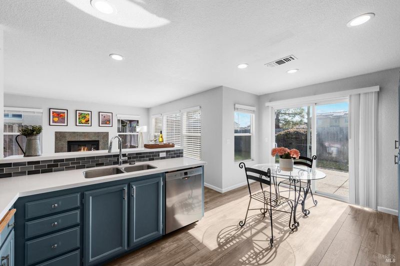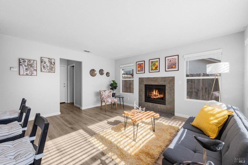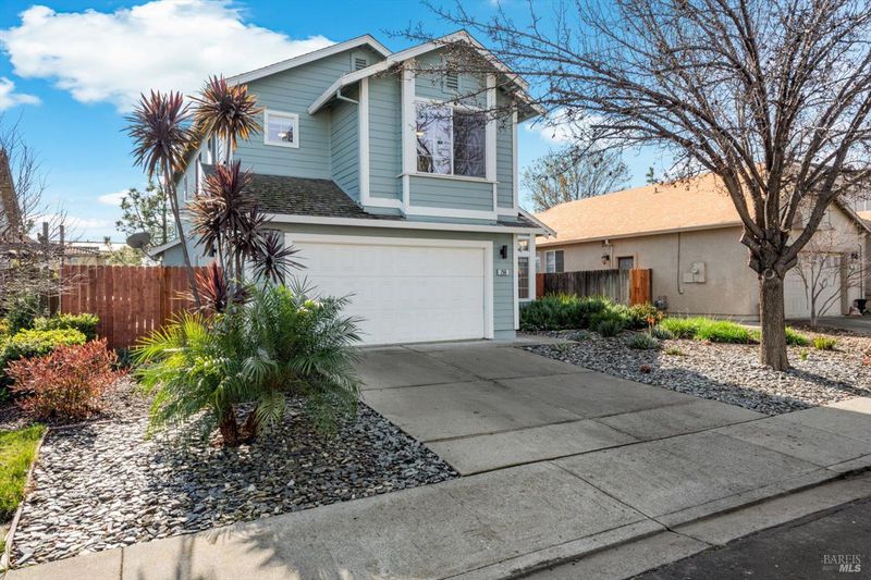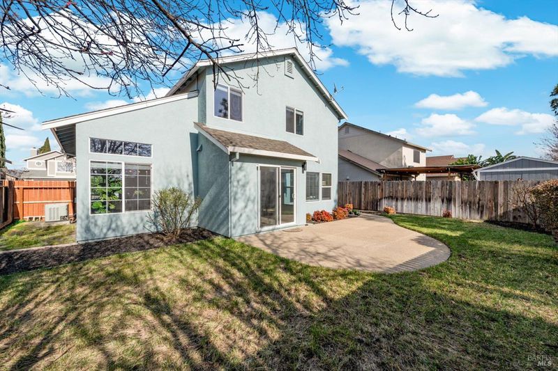 Immaculate and truly move in ready, this beautifully updated Vacaville home with no rear neighbors. Residence showcases a remodeled kitchen and bathrooms with luxury vinyl flooring and fresh interior paint completed in January 2026. The bright kitchen features white quartz countertops, a peninsula dining bar, breakfast area, pantry cabinets, undermount double sink, GE range with griddle, Bosch dishwasher, painted cabinetry, and a stylish tile backsplash, with a sliding glass door opening to the backyard. High ceilings greet you at the entry, while dual pane windows with coverings, a chandeliered dining room, gas fireplace in the family room, and ceiling fans in three bedrooms enhance comfort and style. The spacious primary suite offers a walk-in closet and a well-appointed bathroom with dual sink vanity with a stall shower, while both bathrooms feature newer tile flooring and quartz like shower enclosures. Additional highlights include a new front door, refreshed low maintenance landscaping with new mulch, new front gate and fencing, rear fencing maintenance, downstairs laundry room with cabinets and counterspace, understairs storage, and a garage with workbench and storage. Ideally located near Travis Air Force Base, shopping and dining, this home blends modern upgrades with everyday functionality.