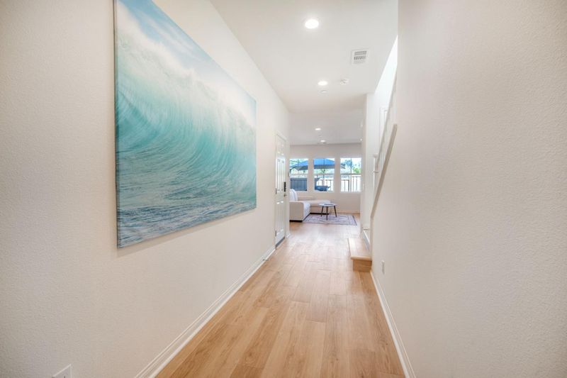 Discover this beautifully crafted 2023-built home, offering 1,908 sq. ft. of contemporary living space. Located in a sought-after community adjacent to Joli Ann Leichtag Elementary and within the award-winning San Marcos School District, this move-in-ready property blends modern design with functional luxury. Inside, discover a spacious open layout featuring Luxury Vinyl Plank flooring on both floors and stairs, enhanced by motorized layered shades. The heart of the home is the contemporary kitchen, featuring Calacatta Idillio countertops and backsplash, upgraded soft-close cabinetry with smart undercabinet lighting, a touchless faucet, a 1,000 CFM smart range hood, and upgraded LG appliances. Designed for efficiency and comfort, the home includes a whole-house water softening/refining system with reverse osmosis, fully paid solar panels, and an EV charger. Step outside to enjoy the landscaped backyard and side entrance with pavers, or utilize the convenient 2-car garage. Ideally located for commuters and locals alike, you are just minutes from Trader Joes and the freeway onramp (5 min), Costco Business Center (7 min), and Carlsbad/Oceanside beaches (20 min)