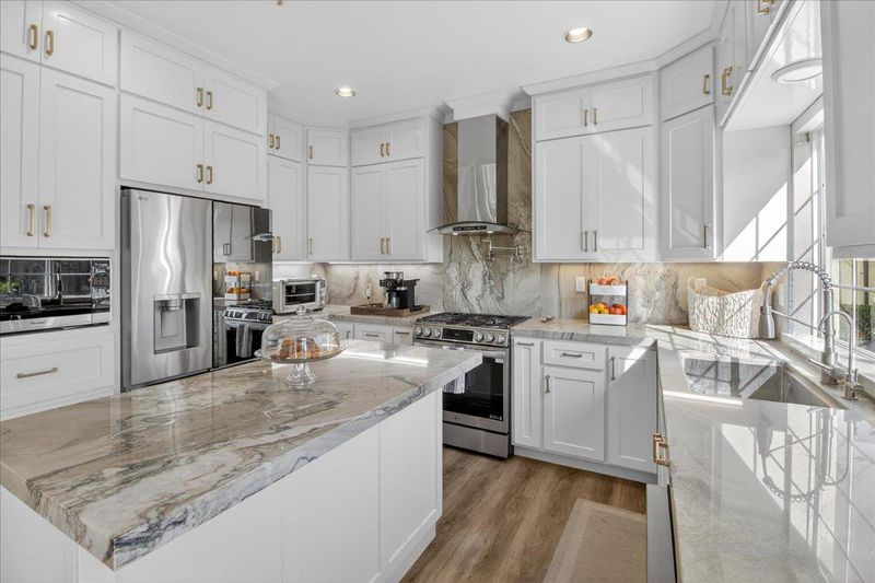 - Countertop - Granite, Dishwasher, Exhaust Fan, Garbage Disposal, Island, Microwave, Oven - Electric, Oven Range - Built-In, Gas, Pantry, Refrigerator, Wine Refrigerator