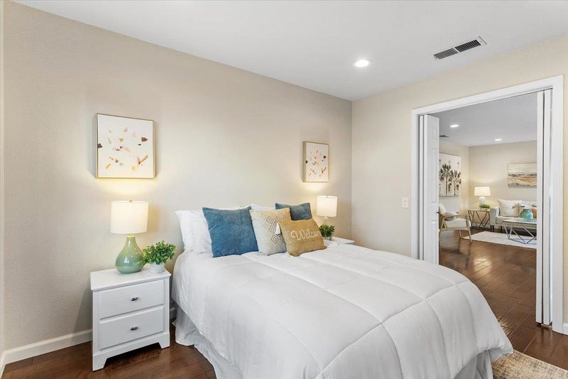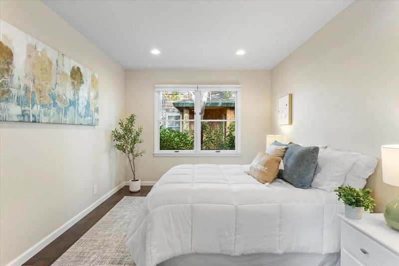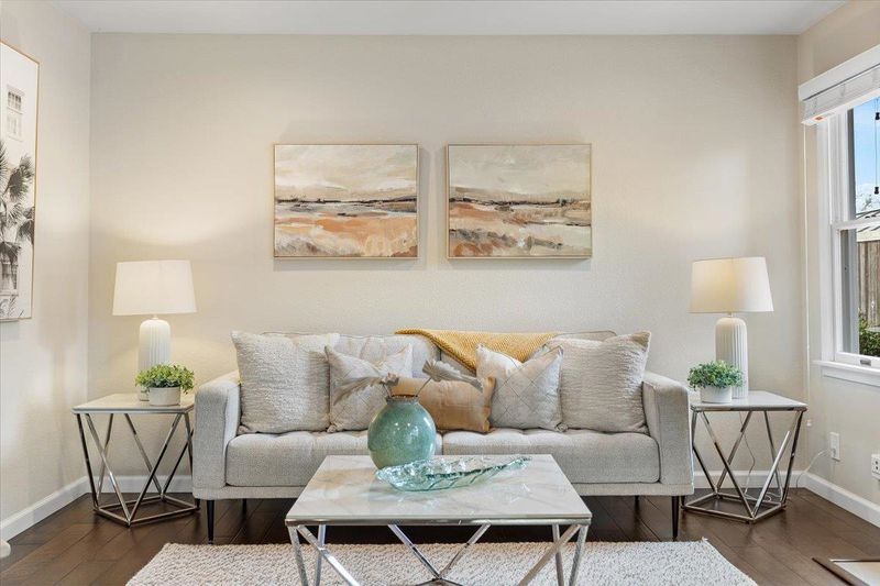 Experience refined coastal living in Harbor Bay Landing in this beautifully updated single-level, 2-bedroom, 1-bath townhome-style condominium where quality, design, and location come together seamlessly. Rich hardwood floors run throughout the living spaces, highlighting a lovely living room with a cozy gas fireplace, perfect for relaxing or entertaining. The updated kitchen features quartz countertops, custom Heath tile, full pull-out pantry shelving, and high-end appliances including a Bosch dishwasher, Bertazzoni dual fuel range, and LG refrigerator. The spacious primary bedroom offers a built-in dresser and generous closet space. The versatile second bedroom is ideal as a guest room or home office. The spa-like bathroom includes a large walk-in shower and custom cabinetry with soft-close drawers and pull-out shelving. The large outdoor patio lives like an extension of the home, offering plenty of space for outdoor dining and entertaining. Located in a gated community with a covered, reserved parking space, just moments from top-rated schools, shoreline trails, the San Francisco Ferry, championship golf, and premier tennis and swim amenities.