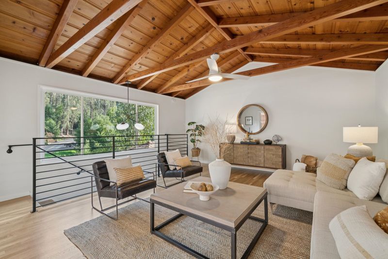 Drenched in sunlight, this sophisticated home features soaring vaulted ceilings and an open-concept floor plan for effortless California living. Antique oak floors, designer lighting, and custom railings add warmth, while nature-filled windows frame serene views. Seamless indoor-outdoor flow connects living spaces to expansive decks, perfect for entertaining. The remodeled kitchen is stylish and functional, with a large island, Caesarstone countertops and backsplash, generous cabinetry, and elegant finishes. Designer bathrooms feature contemporary vanities, designer flooring, and refined details. Four bedrooms and two baths are on one level, including a primary with French doors to a peaceful patio. The lower level offers versatile living with a separate entrance, ideal for a home office, an au pair suite, or extended family, while the upper level includes a spacious living room/den with natural beam ceilings. Mature landscaping and lovely foliage, enhances the setting, while a two-car garage with an adjacent storage room accommodates activity gear. Moments from Montclair Village—with tennis courts, parks, and a storybook library—and close to San Francisco transportation, this home is a rare urban retreat where timeless design, modern comfort, and natural beauty exist in harmony.