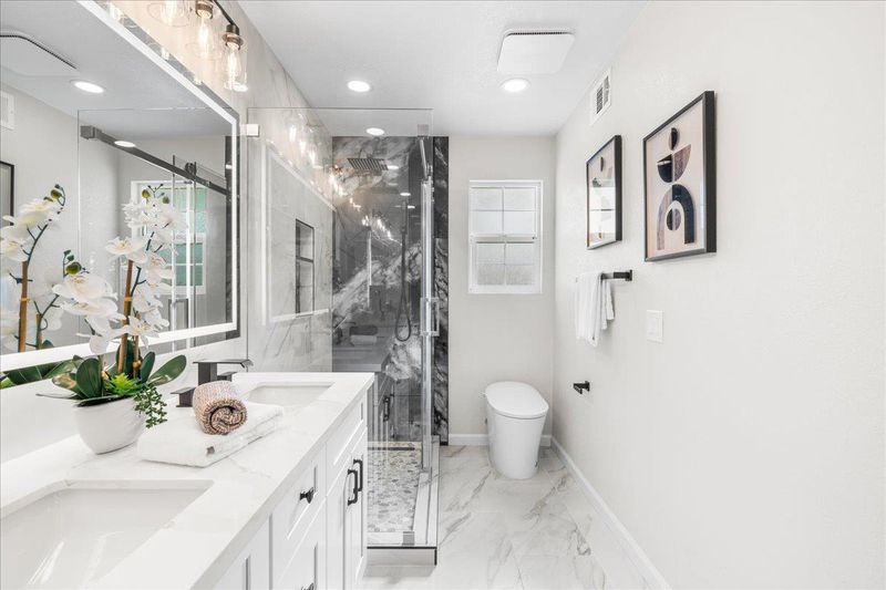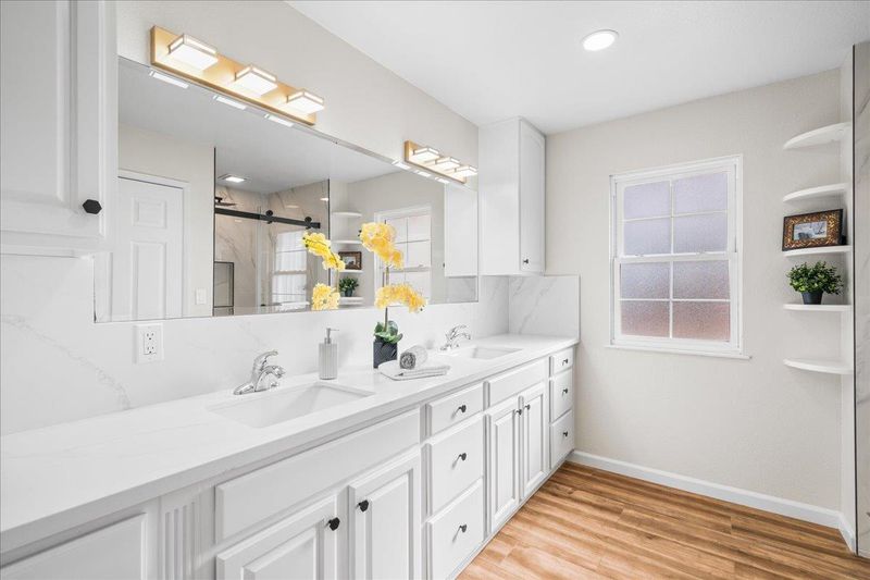- Shower Over Tub, Solid Surface, Split Bath, Stall Shower, Tile, Updated Baths, Double Vanity, Window