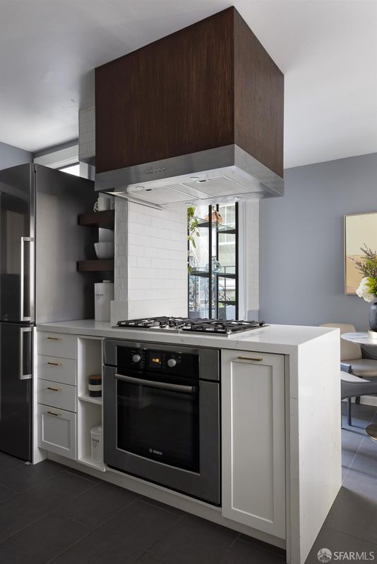 Iconic San Francisco bay windows take center stage, flooding this Marina District one-bedroom condo with southern light and giving the living space its signature sense of scale and elegance. The open floor plan creates clear sight lines and a layout that supports both everyday living and entertaining. Mediterranean architectural details and preserved period elements run throughout the home, adding texture and character that ground the space in San Francisco's architectural tradition. The kitchen has been thoughtfully updated, pairing refined finishes with clean, well-proportioned design, while a generously sized pantry, a counter-height bar suited for casual dining or work-from-home use, and dedicated space for a coffee or tea bar complete the kitchen's functionality. A charming greenhouse-style window draws in additional light and adds a quietly distinctive touch to the dining area. The bedroom features a classic bay window that brings in abundant southern sunlight and is complemented by a substantial walk-in closet with custom built-ins. The renovated bathroom includes a double vanity with mirrored cabinetry, integrated lighting, defogging, and built-in electrical outlets, along with an ample linen closet. The building offers a rooftop deck with Golden Gate Bridge views and a shared backyard. One-car parking, shared laundry, and a dedicated storage unit are included. All of this is set in close proximity to Marina Boulevard, Crissy Field, the Palace of Fine Arts, the Presidio, and the Chestnut Street corridor, within a well-established residential pocket of the Marina District.