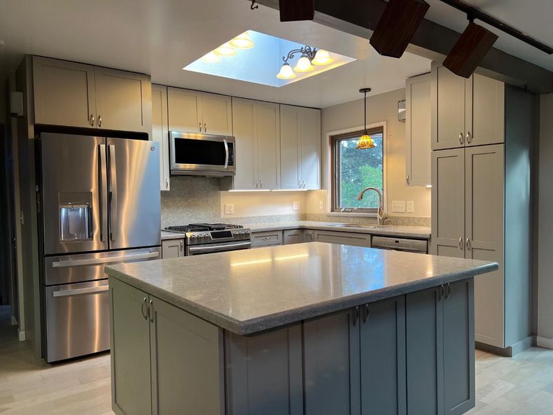 - Cooktop - Gas, Countertop - Quartz, Dishwasher, Garbage Disposal, Hood Over Range, Oven - Gas, Refrigerator, Skylight
