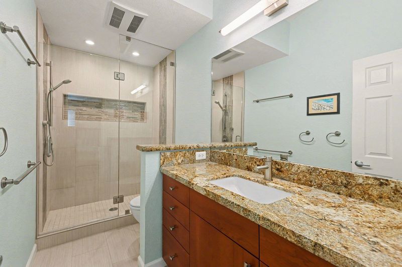 - Shower Over Tub, Solid Surface, Tub, Updated Baths, Granite