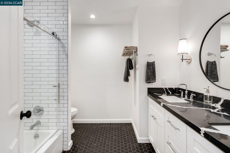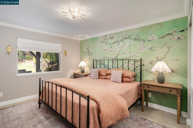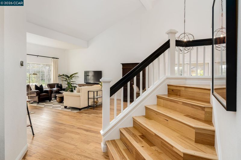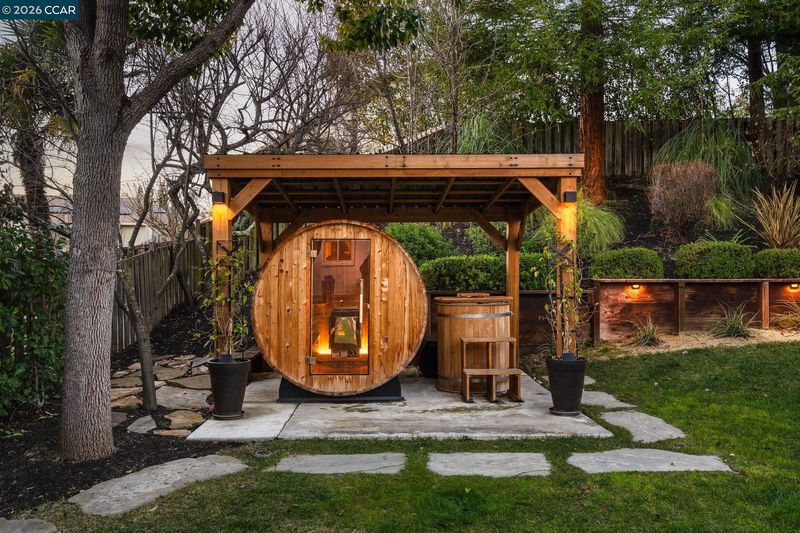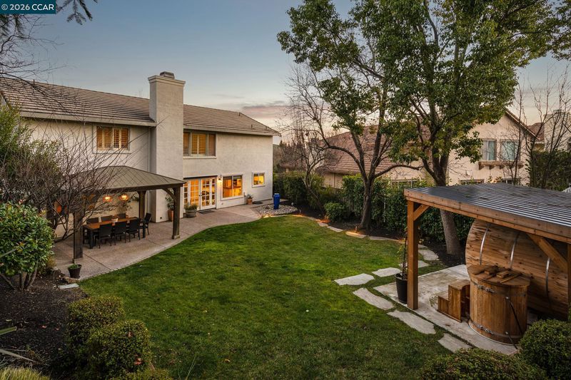 Enter through Main Gate on Buckingham Pl. This beautifully east facing updated 2-story home is filled w/ natural light & designed for everyday comfort. Newer hickory hardwood floors run throughout most of the main living areas & staircase, w/ carpeted bedrooms. The kitchen has tile flooring, white cabinetry w/ quartz countertops, stainless steel appliances, & a large center island. It opens to the family room w/ fireplace—an easy flow for daily living & entertaining. French doors lead to the backyard. All bathrooms have been updated w/ clean finishes, modern vanities, & detailed tile work. There is 1 generous bedroom & full bath on main level with the primary suite & 2 additional secondary bedrooms upstairs. The backyard is lushly landscaped & has a large patio w/ a covered pergola—perfect for outdoor dining. A covered sauna & cold plunge add a unique wellness feature. Enjoy side yard w/ a private seating & relaxation area off the dining room, w/ meyer lemon trees. Enjoy a 3-car garage w/ pull-down storage, w/ the 3rd bay currently as a home office, easily converted back. There are no front neighbors & the home sits across from open space & a walking path. Community amenities: pool, clubhouse, playground, basketball, pickleball, & tennis courts.