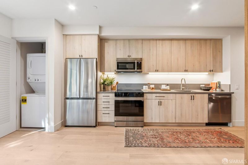 Nestled in the vibrant heart of the Mission & Valencia Corridor, this newly constructed boutique building is a finely tuned balance of function and form, with breathtaking views in every direction. Unit 203 is a custom-finished interior with bespoke cabinetry, under-mount lighting, sleek stainless-steel appliances and exquisite quartz countertops with posh backsplash accents. Refined bathrooms offer custom vanities with under-mount sinks, tub and shower combinations with tile surrounds, and built-in shelving. The living room and dining area feature custom, built-in cabinetry and large windows to maximize the natural light and the serene view to the rear garden. The bedroom boasts its own private patio. These residences are conveniently located near the hottest Valencia Corridor shops and restaurants, and close to BART & public transportation. Features include hardwood floors, in-unit laundry, Samsung/Bosch appliance package, heating & air-conditioning and soundproofing between units & common walls. Building offers garage parking (additional expense), bike storage, shared rear garden & elevator access to all levels including a spectacular shared roof deck with 360 degree views.
