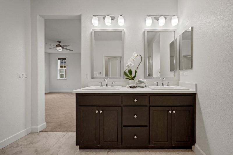 - Double Sinks, Dual Flush Toilet, Half on Ground Floor, Primary - Stall Shower(s), Shower over Tub - 1, Solid Surface, Tile