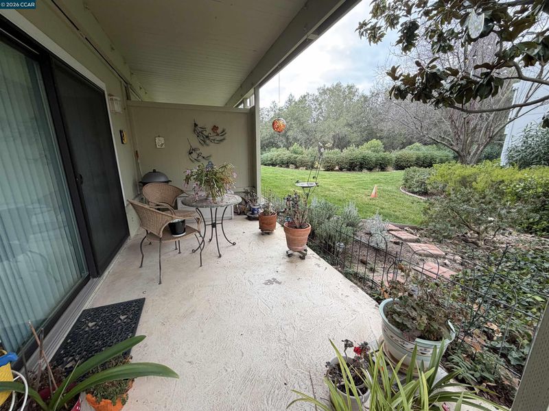 Lovely Carmel model with rare two bedroom, two bathroom layout. Charming end-unit location with lawn and garden-like setting from back patio. Large, fenced front patio provides tons of room for outdoor living. Home updated throughout with dual-pane windows and slider, crown molding, baseboards, and wainscoting. The Kitchen has updated cabinet fronts, stone counters, and mini-tile backsplash. Built-in entertainment center in the Living Room and added shelves in the Dining Area provided lots of great storage options. The Secondary Bedroom makes a great office with a built-in desk and bookshelf system that extends the cabinetry under the window, making a perfect window seat. A Murphy Bed in that room is perfect for providing a bed for guests that can be easily stowed to save floor space. Laundry is a breeze with a stacked washer/dryer in the Guest Bathroom and there's lots of additional storage available in the closet off the front patio and in the carport just steps away from the front door.